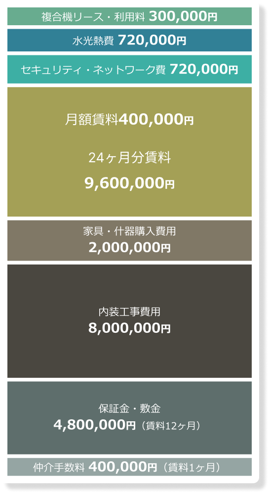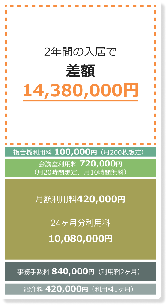 ※ 記載は全て税別。比較表はあくまで概算であり、入居時の家具・什器購入費用、セキュリティ・ネットワーク費用を保証するものではありません。