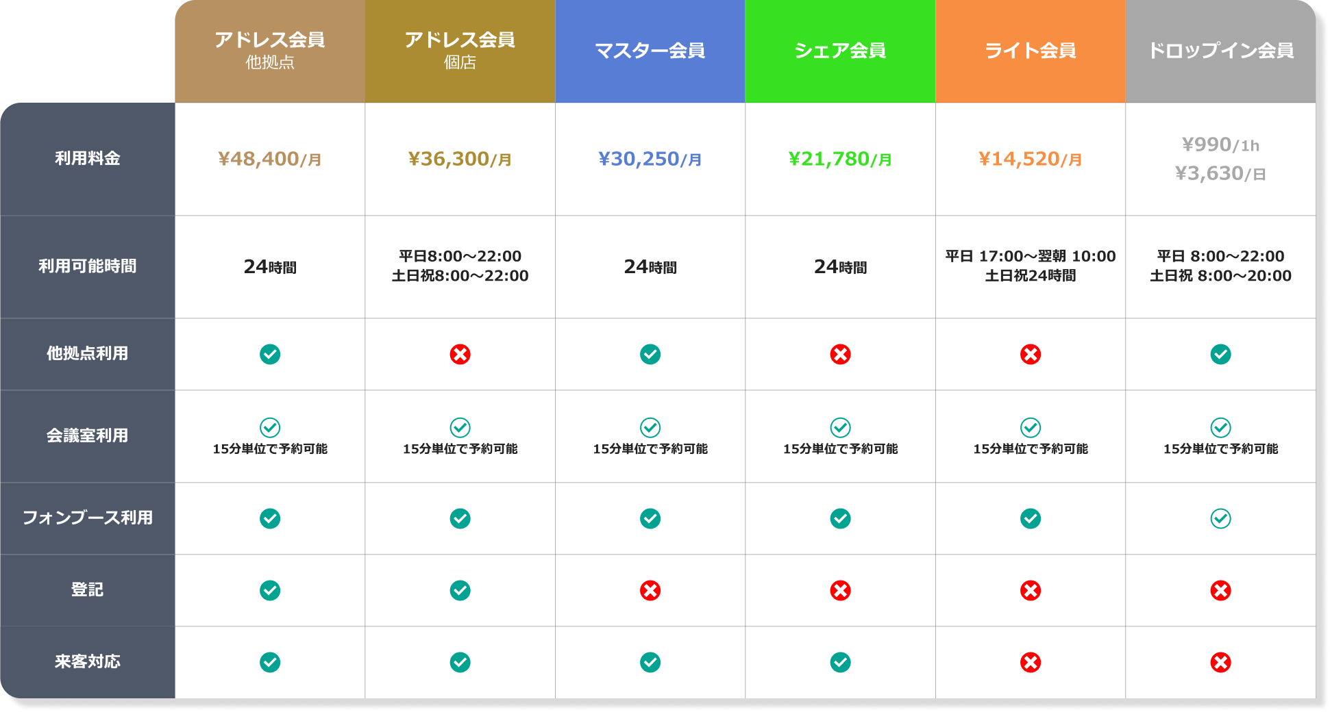 1〜7名対応の「ルーム会員」をはじめとする豊富なプラン、快適なコワーキングエリアに加え、
