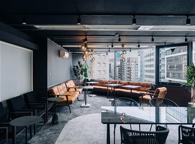 オープンエリアは、受付、フリーアドレスオフィス、カフェスペースの仕切りをなくした開放的な空間です。出張時のビジネス拠点やテレワークなどにも気軽にご利用いただけます。