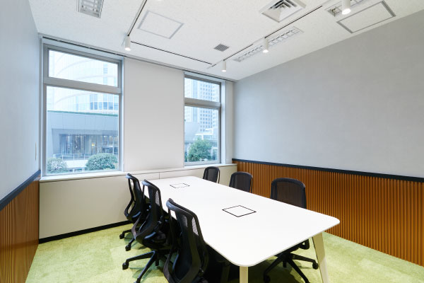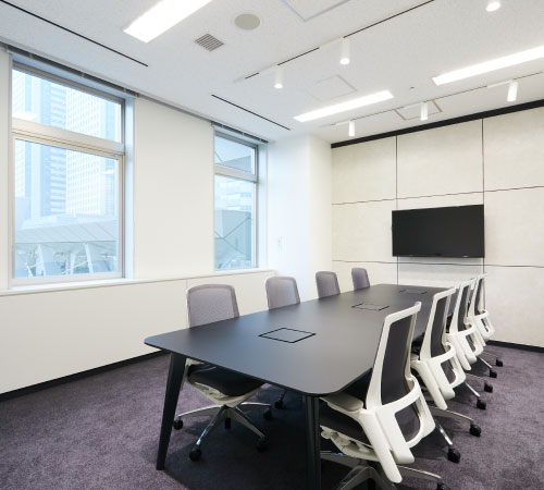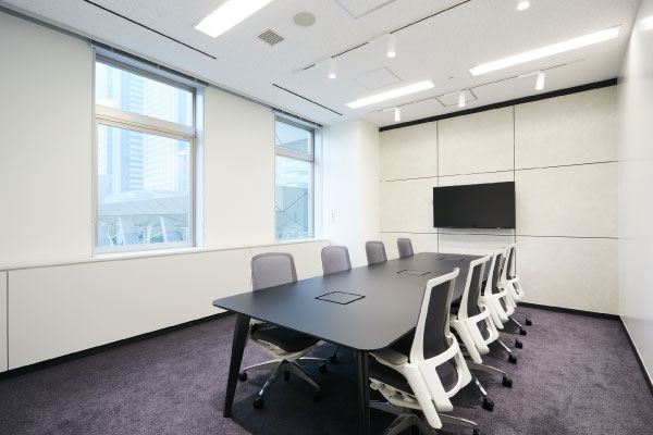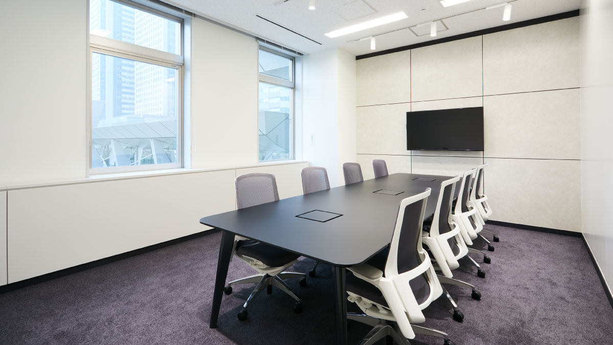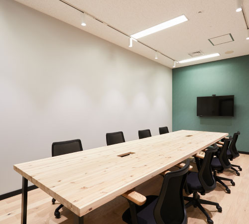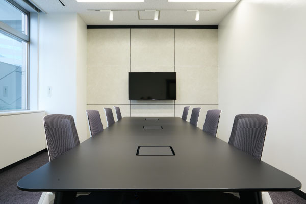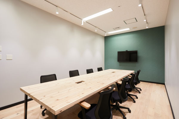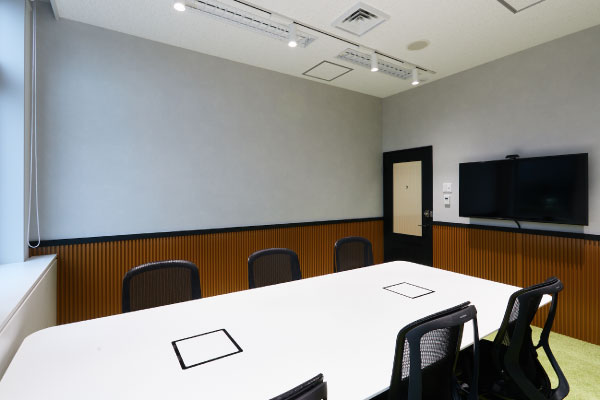 ビジネス利用に特化した、8名様用会議室です。シンプルでありながらも壁面パネルに意匠を入れ込むことで商談でも活用できるモダンな雰囲気に。