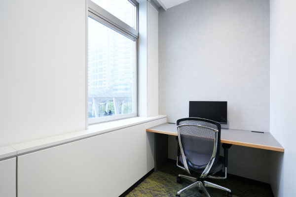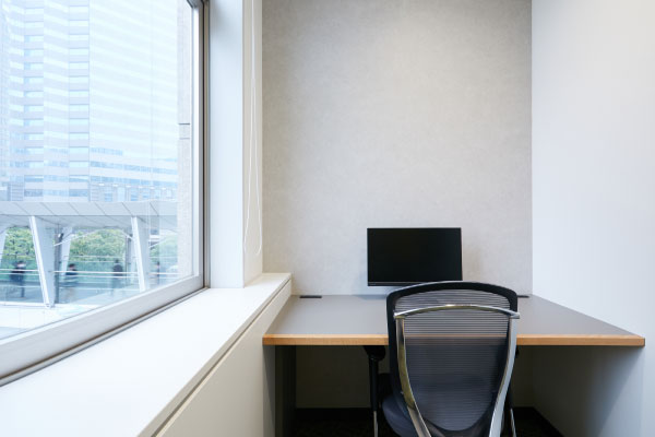 1名用完全個室のワークスペースを10室ご用意。机幅は広く、天井が高いので開放的。